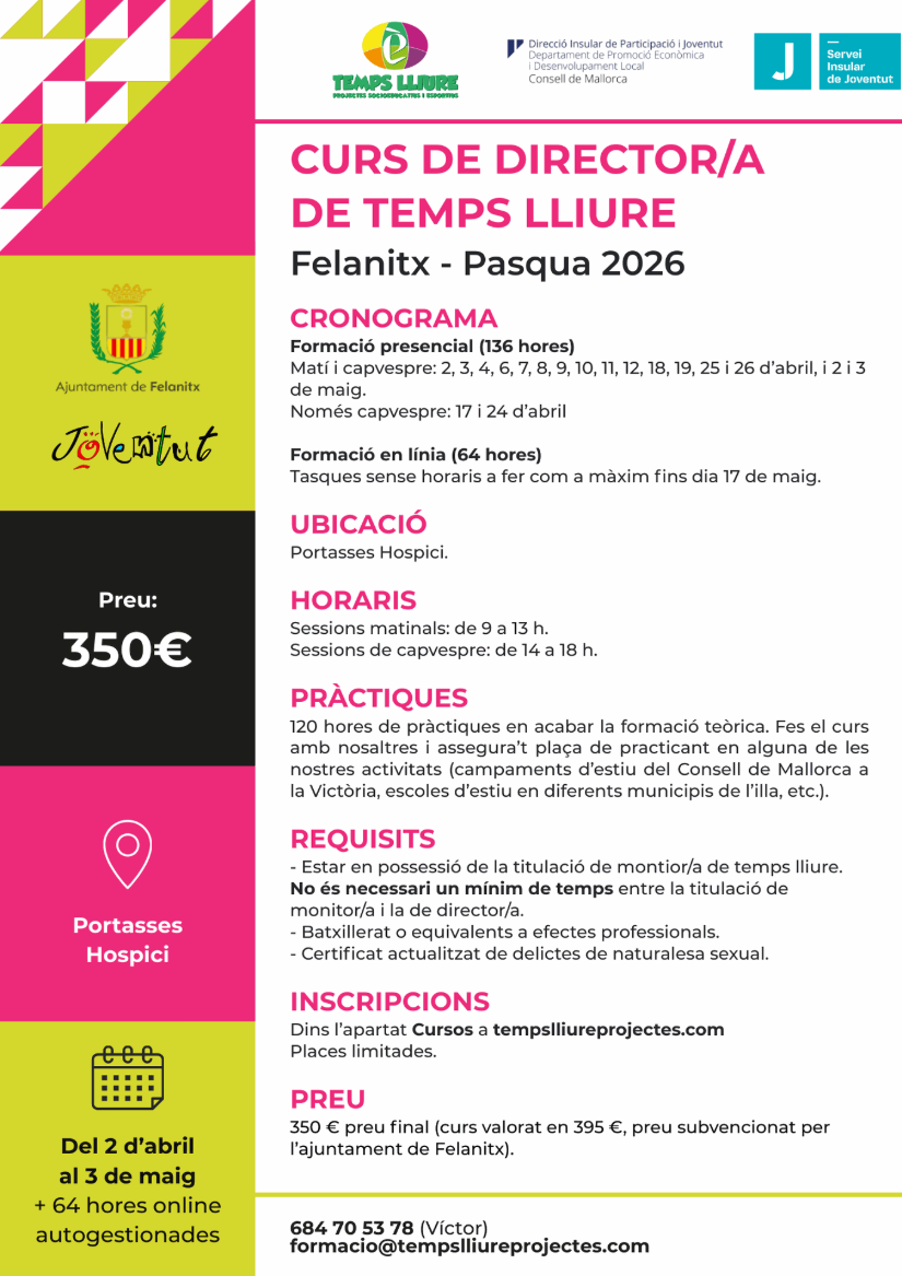 Temps Lliure Projectes és una escola de formació reconeguda oficialment pel Consell Insular de la Joventut, destinada a la formació i la preparació dels educadors de temps lliure infantil i juvenil d'acord amb els programes oficials de la Comunitat Autònoma i del Consell Insular.